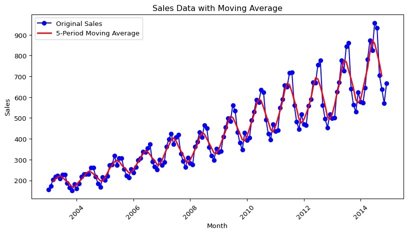 sales_data_ts.plot(figsize=(10, 5), xlabel="Month", ylabel="Sales", title="Sales Over Time")